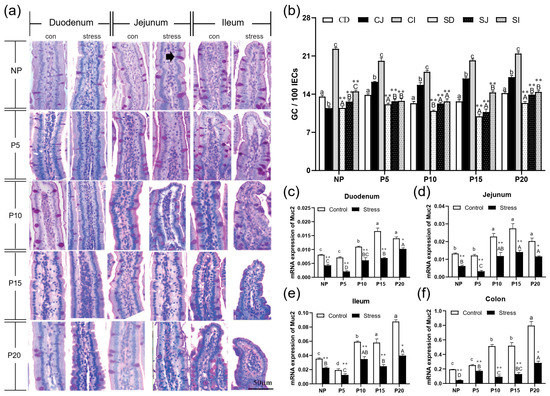 Chronic stress damaged intestinal mucus layer of pregnant mice. (a,b) Expression and distribution of cleaved caspase-3 (a) and PCNA-(b) positive cells in the small intestine of pregnant mice (IHC, scale bars = 50 μm). (c,d) Effect of chronic stress on the hangs of cleaved caspase-3 (c) and PCNA (d) expression of small intestine in pregnant mice (n = 3). ** p < 0.01. Letter casing represents the comparison of different segments at the same age by one-way ANOVA. The lowercase letters represent the comparison of different segments of the control groups at the same age, and the uppercase letters represent the comparison of different segments of the stress groups at the same age. The same letter indicates that the difference is not significant (p > 0.05), while different letters indicate that the difference is significant (p ≤ 0.05). CD: Duodenum of control group; CJ: Jejunum of control group; CI: Ileum of control group; SD: Duodenum of chronic stress group; SJ: Jejunum of chronic stress group; SI: Ileum of chronic stress.