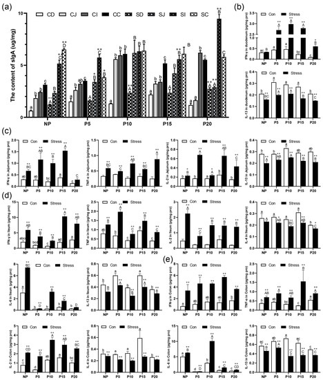 To investigate the effect of chronic stress on intestinal mucosal immune function in pregnant mice, we detected the sIgA concentration in intestinal mucosa and intestinal inflammatory cytokines using ELISA and CBA of different day age mice. sIgA plays an important role in intestinal immunity. It is mainly produced by IgA plasma cells in the lamina propria of intestinal mucosa. When intestinal mucosal epithelium is damaged, sIgA secretion is bound to be affected. We found that the sIgA concentration gradually increased from the duodenum to the ileum of NP, P5 (except ileum), P10, P15, and P20 (except ileum) (Figure 5a). Moreover, sIgA concentrations increased by 4.97%~130.62% (p = 0–0.032) after chronic stress in all stages during pregnancy (Figure 5a). Furthermore, the concentrations of the pro-inflammatory cytokines IFN-γ (p = 0–0.117), TNF-α (p = 0–0.021), IL-2 (p = 0–0.104), and IL-6 (p = 0–0.004) increased significantly by 10.57%~1136.93% in duodenum, jejunum, and ileum after chronic stress in all stages during pregnancy. The anti-inflammatory cytokines IL-4 (p = 0–0.034) and IL-13 (p = 0–0.008) had an opposite trend and decreased by 13.90%~51.94% (Figure 5b–e). The overall results showed an increase in pro-inflammatory cytokine concentration and a decrease in anti-inflammatory cytokines in the pregnant mice group. These data indicated that chronic stress could promote abnormal activation of intestinal immunity in mice, leading to intestinal inflammation.