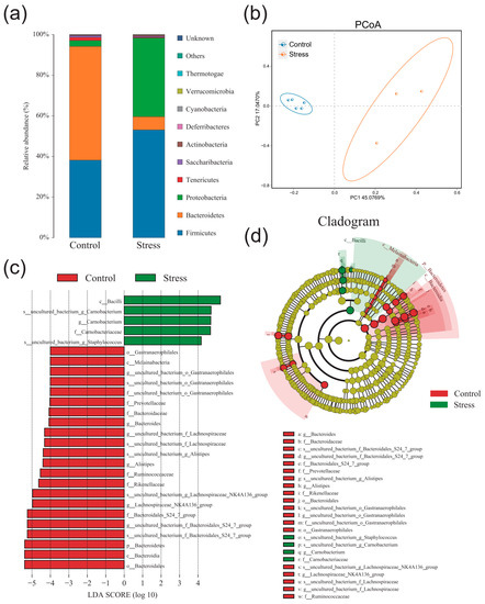 Chronic stress reduces the diversity of intestinal microorganism in the P10 group. (a) Species abundance histogram at the phylum level in the P10 group after chronic stress (n = 3–5). (b) PCoA analysis in the P10 group after chronic stress (n = 3–5). (c,d) Cladogram and LDA score in the P10 group after chronic stress (LDA score > 4.0) (n = 3–5).