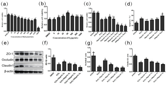 (a) Effect of H2O2 on IPEC cell viability (n = 4). (b) Effect of E2 on IPEC cell viability (n = 4). (c) Effect of E2 on IPEC cell viability with H2O2 treatment (n = 4). (d) Effect of E2 on apoptosis of IPEC cell lines in H2O2 damaged by flow cytometry analysis. (e) The expression of jejunum tight junction protein ZO-1 (e,f), Occludin (e,g), Claudin-1 (e,h), and β-actin (e) protein were examined by western blotting in H2O2-damaged IPEC cell, and relative protein levels were normalized to β-actin (n = 3). The same letter indicates that the difference is not significant compares with others group (p > 0.05), while different letters indi-cate that the difference is significant (p ≤ 0.05).