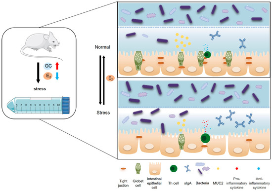 As the most important immune organ, the intestine plays a critical role in overall health. A growing body of research has shown that chronic psychological stress impairs immune response, reduces the body’s immunity, increases intestinal permeability, and promotes diseases such as inflammation bowel disease (IBD) and cancer [8,9,10]. Psychological stress has also been identified as an important factor in the development of irritable bowel syndrome, significantly impacting intestinal sensitivity, motility, secretion, and permeability [11].