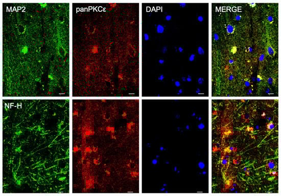 PKCε is expressed by cortical neurons in human primary motor cortex. Representative photomicrographs show panPKCε expressed in cortical neuronal cells (MAP2+ or NF-H+) examined under a Nikon A1 confocal inverted microscope equipped with a Plan Apochromat lambda 60×/1.4 oil immersion lens (Nikon, Tokyo, Japan). Scale bar 10 μm.