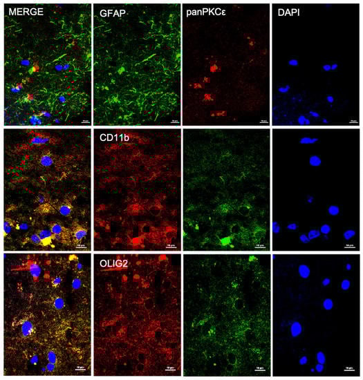 PKCε is widely expressed throughout the body, predominantly in brain regions [25,36,47] such as the hippocampus, Calleja’s islands, olfactory tubercle, cerebral cortex, septal nuclei, nucleus accumbens, frontal cortex, striatum and caudate putamen [45]. In the present study, we detailed PKCε distribution in the postmortem human primary motor cortex, describing its expression in cortical neurons (MAP2+ or NF-H+), microglial cells (CD11b+) and oligodendrocytes (OLIG2+), but barely in astrocytes (GFAP+).