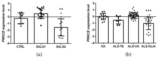 The first analysis relied on the E-MTAB-2325 transcriptomic dataset, which collected the whole-genome microarray RNA profiles of the motor cortex from 31 sporadic ALS samples and 10 controls. The previous examination of these RNA profiles had revealed a clear transcriptional-based clustering of subjects into three distinct groups: control (n = 10), SALS1 (n = 18) and SALS2 (n = 13) subtypes, each associated with different molecular features and potential drug targets [14,16,38]. Among the multiple differentially expressed genes, PRKCE emerged as significantly decreased in SALS2 (not in SALS1) patients compared to the controls (Figure 3a).