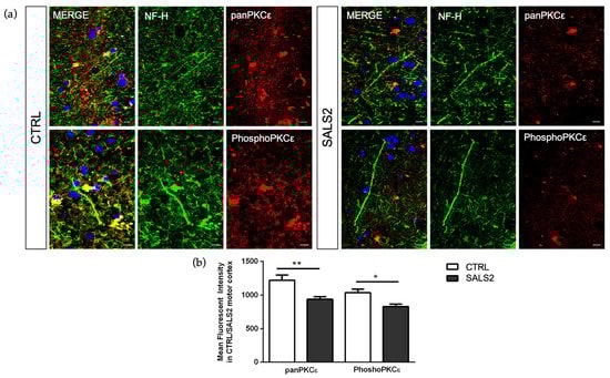 The panPKCε and phosphoPKCε levels are reduced in motor cortex area of SALS2 patients. (a). Representative images showing panPKCε and phosphoPKCε immunoreactivity in motor cortex area (characterized by NF-H positive staining) of control and SALS2 patients. (b). Fluorescence mean intensity, quantified by examining samples under a Nikon A1 confocal inverted microscope equipped with a Plan Apochromat lambda 60×/1.4 oil immersion lens (Nikon, Tokyo, Japan). The mean intensity of TRITC channel was extrapolated from multiple regions of interest (ROI) and normalized to the background by using the NIS-Elements AR (Advanced Research) software (version 4.60). Scale bar 10 μm. Tukey–Kramer post hoc test: ** p < 0.01 SALS2 vs CTRL for panPKCε, * p < 0.05 SALS2 vs. CTRL for phosphoPKCε.