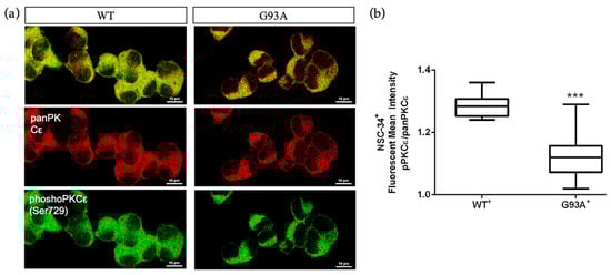 NSC-34 cells expressing human WT or SOD1-G93A were cultured on glass cover slips, fixed in 4% paraformaldehyde and processed in order to perform an immunofluorescence assay [12,59]. The samples were probed with specific primary antibodies: anti-PKCε (sc-1681, Santa Cruz Biotechnology, Inc. Dallas, TX, USA, 1:200), anti-phosho-S729-PKCε (#44-977G, Thermo Fisher Scientific, Waltham, MA, USA, 1:200); Alexa Fluor 488 Goat anti-rabbit and Alexa Fluor 594 Goat anti-mouse were used as secondary antibodies (Jackson Immuno-research). The analyses were performed by using confocal microscopy, as reported elsewhere [60]. The fluorescence was quantified by extrapolating the mean intensity of each channel from multiple regions of interest (ROI) and normalized to the background [12] by using the NIS-Elements AR (Advanced Research) software.