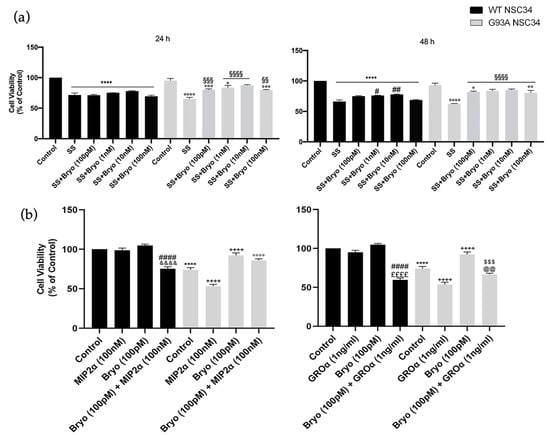 Based on the observed PKCε downregulation in the ALS condition, we wondered about the downstream pharmacological effects of PKCε agonism in vitro and examined the biological outcomes of PKCε pulse activation by Bryostatin-1 in WT and G93A NSC-34 cells in two different paradigms of cell death models. Induction to apoptosis in both WT and G93A doxy-activated cells was prompted by: (i) serum starvation at either 24 or 48 h, or (ii) co-incubation with toxic chemokines (i.e., MIP2α and GROα) for 48 h. This second apoptosis model derives from previous observations conducted in our laboratories [40], which highlighted the vulnerability of G93A cells to MIP2α and GROα ligand treatment. Indeed, in the chemokines-induced cell death paradigm, the G93A NSC-34 cells displayed more sensitivity to apoptosis compared to the WT NSC-34, showing a peculiar significant reduction of cell viability in the presence of GROα and MIP2α (Figure 6b).