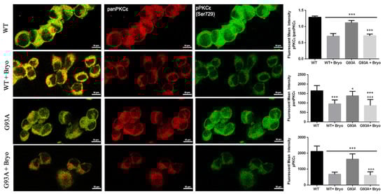 Previous data on Bryostatin-1 showed it produces a time-dependent biphasic effect on PKCε levels since it immediately binds PKCε promoting its self-phosphorylation and translocation from cytosol to membrane fractions [34,41], and then the enzyme undergoes a downregulation phase for several hours, followed by de novo synthesis. We therefore measured PKCε immunoreactivity after 48 h from Bryostatin-1 pulse activation and, concordantly with previous observations, detected late decreased levels of the phosphoPKCε/panPKCε ratio in both the WT and G93A NSC-34 cells (Figure 7).