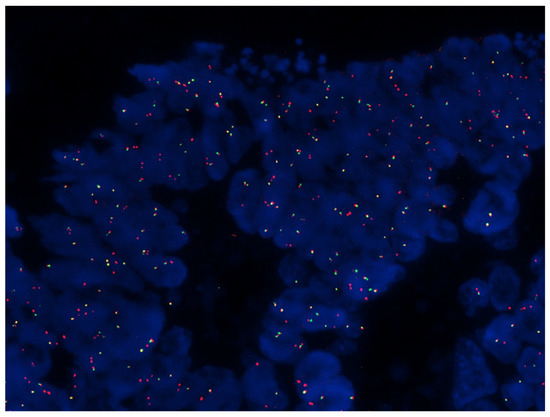 RNA sequencing was performed on 28 samples, divided as follows: M0 (n = 10), LM (n = 9), and PM (n = 9). Data analysis revealed no splice variants for the genes in the panel, whereas three samples (one M0 and two PM samples) showed gene fusion transcripts, which are summarized in Table 2. Interestingly, two gene fusions were identified which can be considered driving mutations, i.e., FAM198A-RAF1 and TARSL2-NTRK3. The NTRK3 fusion was confirmed via fluorescence in situ hybridization (FISH), using an NTRK3 break-apart probe (Figure 3).