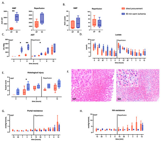 Hepatocellular injury and function, histological damage, and intrahepatic vascular resistance during NMP and reperfusion of directly procured livers (DP—red) or livers exposed to 60 min of WI prior to procurement (WI—blue). Boxes represent median and interquartile range; whiskers represent total range. (A,B) Area under the curve for AST (A) and lactate (B) during entire NMP and reperfusion. (C,D) Longitudinal evolution of perfusate concentrations of AST (C) and lactate (D). (E) Longitudinal evolution of histological injury as quantified by the Suzuki score. (F) Micrographs from representative H&E-stained sections pf a DP (left) and WI (right) liver, taken at the end of reperfusion: 200× magnification, insert at 400× magnification). (G,H) Longitudinal evolution of the portal resistance (G) and hepatic artery (HA) resistance (H). * p < 0.05 and ** p < 0.01 as tested by pairwise comparison using two-way ANOVA at the indicated timepoint; AUC, area under the curve; DP, direct procurement; WI, WI; AST, aspartate transaminase; NMP, normothermic machine perfusion.