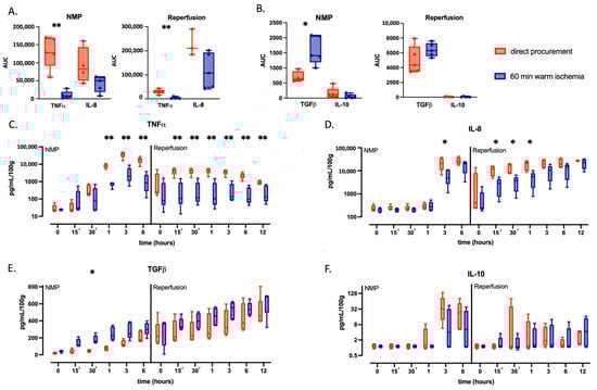 Perfusate concentrations, normalized for liver weight, during NMP and reperfusion, of directly procured livers (DP—red) and livers exposed to 60 min of WI prior to procurement (WI—blue). Boxes represent median and interquartile range; whiskers represent total range. (A,B) AUCs of all cytokines during NMP and reperfusion. (C–F). Longitudinal evolution of perfusate cytokine concentrations during NMP and reperfusion. * p < 0.05 and ** p < 0.01; AUC for pairwise comparisons with two-way ANOVA at the indicated timepoint. AUC, area under the curve; NMP, normothermic machine perfusion; TNF-α, Tumor Necrosis Factor-α; IL-8, interleukin-8; IL-10, interleukin-10; TGF-β, Transforming Growth Factor-β.