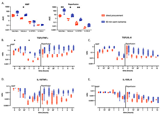 Ratios of perfusate concentrations of pro- (TNF-α and IL-8) and anti-inflammatory (TGF-β and IL-10) cytokines during NMP and reperfusion of directly procured livers (DP—red) and livers exposed to 60 min of WI prior to procurement (WI—blue). Boxes represent median and interquartile range; whiskers represent total range. The AUC (A) and longitudinal evolution (B–E) of ratios between anti- and pro-inflammatory cytokines are shown. * p < 0.05 and ** p < 0.01; AUC for pairwise comparison with two-way ANOVA at the indicated timepoint. AUC, area under the curve; NMP, normothermic machine perfusion; TNF-α, Tumor Necrosis Factor-α; IL-8, interleukin-8; IL-10, interleukin-10; TGF-β, Transforming Growth Factor-β.