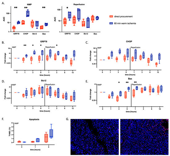 Tissue expression of ER stress-related transcription factors during NMP and WB reperfusion in directly procured livers (DP—red) or livers exposed to 60 min of WI prior to procurement (WI—blue). Boxes represent median and interquartile range; whiskers represent total range. Shown are the AUC’s of ER stress related gene expression (A), the longitudinal evolution of tissue gene expression of GRP78 (B) and CHOP (C) during NMP and reperfusion, longitudinal evolution of tissue gene expression of Bcl-2 (D) and Bax (E) during NMP and reperfusion, and longitudinal evolution of proportions of TUNEL-positive cells during NMP (F). Micrograph from a representative TUNEL-stained section (G) is shown at 20× magnification (DP liver on the left, WI liver on the right). * p < 0.05 and ** p < 0.01 for pairwise comparisons with two-way ANOVA at the indicated timepoint; NMP, normothermic machine perfusion; GRP78, glucose-regulated protein-78; CHOP, C/EBP homologous protein; Bcl-2, B-cell lymphoma 2; Bax, Bcl2-associated X protein.