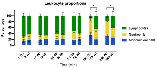 Shown are the leukocyte proportions in the perfusate as determined by cell counting at different timepoints during NMP in directly procured (DP) and 60 min warm ischemia (WI)-exposed livers. * p < 0.05, error bars represent interquartile range; DP, direct procured livers; WI, warm ischemic livers.