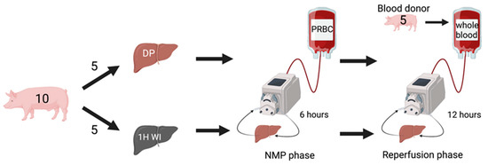 Porcine livers were either exposed to 60 min of WI (WI group, n = 5) before procurement or were directly procured (DP group, n = 5), followed by NMP for six hours. After six hours, the perfusate was changed to allogenic WB from a donor pig, and the liver was reperfused for 12 h to mimic transplantation (Figure 6). The allocation to the experimental group was randomized. To assess hepatocellular injury, perfusate levels of AST and histological injury were measured. Lactate clearance was measured as indication for hepatocellular function. TNF-α, IL-8, IL-10, and TGF-β were measured sequentially during NMP and WB reperfusion to assess inflammatory response. On liver biopsies taken at baseline, one hour, three hours, and six hours during NMP, GRP78, CHOP, Bcl-2, and Bax expression were measured to reflect endoplasmic reticulum (ER) stress and apoptotic signaling. Furthermore, immunohistochemistry was performed to assess apoptosis (TUNEL staining). Lastly, leukocyte mobilization was assessed through cell counts on perfusate smears. Perfusate samples were taken at baseline (before the liver was connected to the perfusion circuit), 15 min, 30 min, one hour, three hours, and six hours during NMP. During WB reperfusion, perfusate and tissue samples were taken at the same time point as during NMP, with an additional sampling at 12 h.