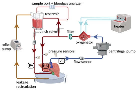 Schematic presentation of the perfusion circuit, as previously described [33]. Briefly, the liver is perfused in a closed circuit, with canulation of the portal vein, hepatic artery, and infrahepatic vena cava, and the suprahepatic vena cava is closed. Portal inflow is provided from a reservoir, where the pressure is determined by the hydrostatic column, whereas arterial inflow is directly provided by the centrifugal pump. An oxygenator is incorporated in the circuit, and a heater enables perfusion at 38 °C.