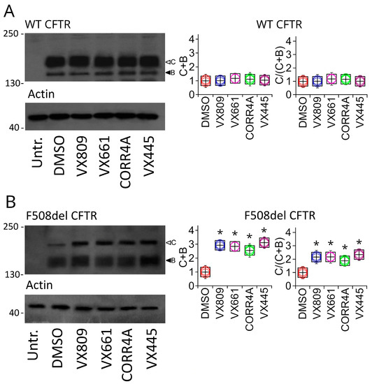 Detection of full-length WT and F508del CFTR proteins by Western blot. Detection of WT (A) and F508del CFTR (B) in lysates of untransfected (untr.) and transiently transfected HEK-t cells treated with DMSO (control), VX809, VX661, CORR4A, and VX445 is shown in the upper panels on the left. Expression of the housekeeper protein actin in the same samples is shown in the lower panels. The molecular weight of the proteins of the molecular weight marker that was run in the SDS-PAGE is indicated on the left of each blot. Black and white arrowheads indicate the positions of bands B and C, respectively. Bar graphs showing the quantification of the expression of total (calculated as the sum of bands B and C) and mature, fully glycosylated (expressed as C/(C + B) ratio) WT or F508del CFTR isoforms are shown in the middle and on the right of the figure. The expression level of each band was normalized to the level of actin detected in the same samples and expressed relative to the expression level of the control sample. For each condition, the black boxes represent the mean ± standard error of the mean (sem), while colored circles are the single measurements. At least 4 independent experiments were performed. Statistical comparison of the data was performed by Dunnett’s multiple comparisons test (all groups against the control group). Asterisks indicate statistical significance versus control, DMSO-treated samples: * p < 0.05.
