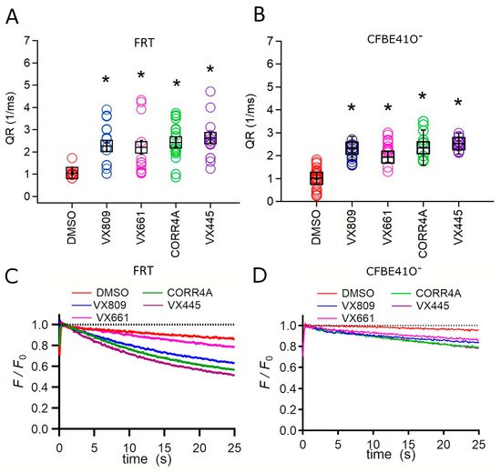 Evaluation of F508del CFTR channel function. Channel activity expressed as the initial fluorescence quenching rate (QR) of the yellow fluorescent protein (YFP) elicited by the iodide influx in FRT (A) and CFBE41O− (B) cells permanently co-transfected with the YFP and the F508del CFTR proteins. Time course of the fluorescence decay in FRT (C) and CFBE41O− (D) cells incubated with the correctors under study. The fluorescence was normalized to the initial value obtained after the addition of iodide. Cells were treated with DMSO, 5 μM VX809, 5 μM VX661, 10 μM CORR4A, and 5 μM VX445. For each condition, the black boxes represent the mean ± standard error of the mean (sem), while colored circles are the single measurements. For each condition, each measurement (n) was repeated at least 10 times. Asterisks indicate a significant difference (* p < 0.05) compared to the control, DMSO-treated samples.