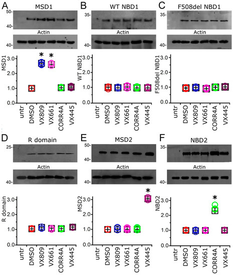 To verify whether the treatment with the compounds under study could determine an increase in the expression of any single domain of the CFTR protein, we transiently transfected HEK-t cells with MSD1, WT and F508del NBD1, R domain, MSD2, and NBD2 and successively treated them with 5 μM VX809, 5 μM VX661, 10 μM CORR4A, and 5 μM VX445 for 24 h. Immunoblots of whole-cell lysates from CFTR single domain transfected HEK-t cells are shown in the upper panels of Figure 3A–F. MSD1 was revealed by the MM13-4 antibody as an electrophoretic band of ~45 kDa, while both WT and F508del NBD1 polypeptides were detected as bands of ~32 kDa by the L12B4 antibody. The R domain had an apparent molecular weight of ~22 kDa. The primary antibodies raised against the MSD2 and NBD2 domains revealed these polypeptides as bands of ~47 and ~30 kDa, respectively. Controls in untransfected HEK-t cells showed that no CFTR single domain was detected in the blots by the primary antibodies that were used. Table S6 summarizes the characteristics of the primary antibodies used in this work.