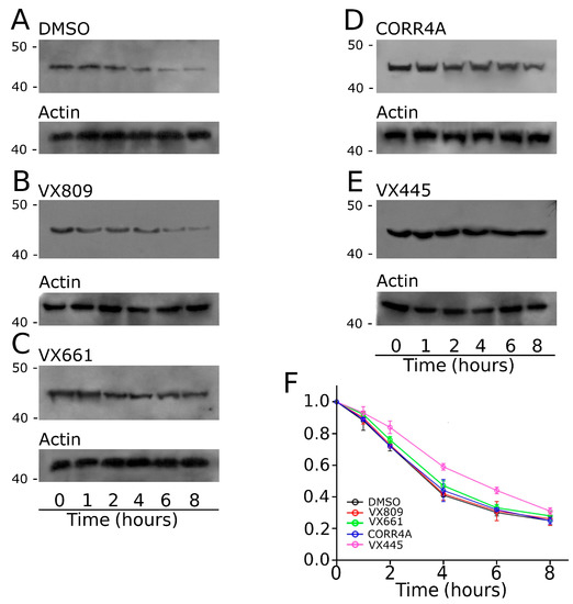 Evaluation of MSD2 stability by means of the cycloheximide chase approach. Expression of the MSD2 polypeptide in HEK-t cell lysates treated with DMSO (A), 5 µM VX809 (B), 5 µM VX661 (C), 10 µM CORR4A (D), and 5 µM VX445 (E) and subjected to protein synthesis inhibition by means of incubation with 0.5 mg/mL cycloheximide. The lanes of each blot represent 6 different time points as indicated at the bottom of the figure. For each condition, the expression of the protein actin is shown in the lower panels of (A–E), respectively. The molecular weight of the protein of the molecular weight marker that was run in the SDS-PAGE is indicated on the left of each blot. (F) Expression of the MSD2 protein at each time point. Data are expressed as means ± SEM of at least 4 independent experiments. In the legend of the figure, we indicate the symbols used to represent each compound used in the experiment. For all conditions under analysis, the amount of the MSD2 protein was normalized to actin and expressed relative to time 0.
