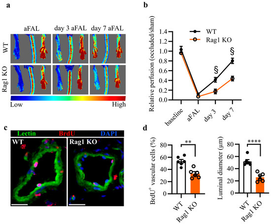 To verify whether the decreased perfusion recovery was due to insufficient vascular cell proliferation and vascular growth, WT mice and Rag1 KO mice were treated with the proliferative marker, BrdU. Vascular cell proliferation and luminal diameter were evaluated through immunofluorescence staining for BrdU and lectin in adductor muscles collected on day 7 aFAL (Figure 1c). In accordance with our perfusion recovery data, Rag1 KO mice showed a significantly decreased vascular cell proliferation and a smaller inner luminal diameter compared to WT mice (Figure 1c,d).