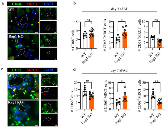 Macrophages are known to act as key regulators of inflammation and tissue regeneration [18]. Studies focusing on the spatial and temporal distribution of perivascular macrophages have revealed their critical role in arteriogenesis [19]. To understand the perivascular macrophage dynamics in Rag1 deficient mice, we investigated the number and polarization of macrophages in the perivascular space of growing collateral arteries at day 3 (Figure 2a,b) and day 7 aFAL (Figure 2c,d). We used CD68 as a pan-macrophage marker while the MRC1 marker was used to distinguish between inflammatory (M1-like) and regenerative (M2-like) macrophage polarization. Accordingly, CD68+MRC1− macrophages were defined as M1-like polarized, while CD68+MRC1+ were defined as M2-like polarized macrophages. Our immunofluorescence analysis revealed that the number of perivascular macrophages remained statistically similar between Rag1 KO and WT mice across both evaluated time points. However, macrophage polarization analysis revealed that Rag1 KO mice showed a significantly increased number of macrophages with M1-like polarization at day 3 and day 7 aFAL (Figure 2b,d). The number of M2-like polarized macrophages showed a decreasing trend on day 3 aFAL in Rag KO mice (Figure 2a,b); however, the value was significant at day 7 aFAL (Figure 2c,d).