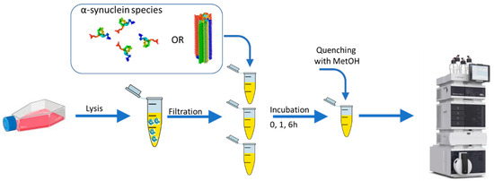Sample preparation scheme for LC-MS metabolomic analysis. Neuronal cell lysate samples (with proteins and larger molecules removed) were treated with 20 µM freshly gel-filtered monomeric α-synuclein or pre-formed amyloids for 0 (no incubation, control), 1, and 6 h. Methanol (MetOH) was used to precipitate α-synuclein and, thus, quench any ongoing reactions. This also facilitated the removal of the protein by centrifugation prior to LC-MS analysis of the resulting metabolites.