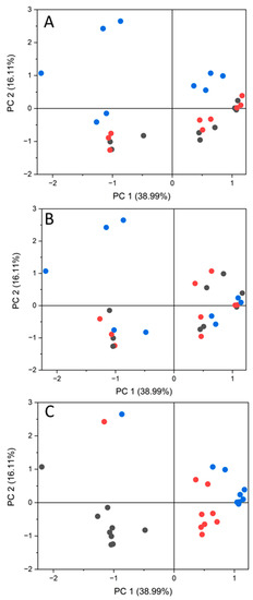 Multivariate PCA of the 63 identified metabolites with coloring according to (A) Treatment: black, lysate + buffer; red, lysate + monomer; blue, lysate + fiber, (B) Incubation time: black, 0 h; red, 1 h; blue, 6 h, and (C) Biological replicate (lysate batch): black, batch 1; red, batch 2; blue, batch 3.