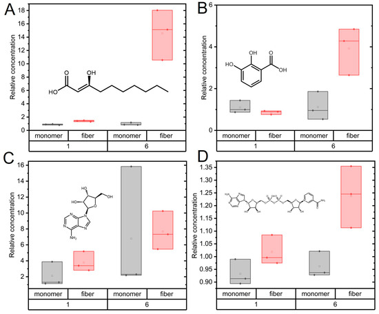 Time-dependent changes (1 and 6 h as compared to 0 h) of metabolites which showed increased levels with amyloid fiber treatment compared to monomer treatment. α-synuclein fibers (red) or monomers (black) treatments are shown as box plots. (A) 3-hydroxycapric acid; (B) 2-pyrocatechuic acid/2,4 dihydroxybenzoic acid; (C) adenosine; (D) NAD. The boxes cover the full range of the data; the line denotes the median. Chemical structures of metabolites are shown as insets.