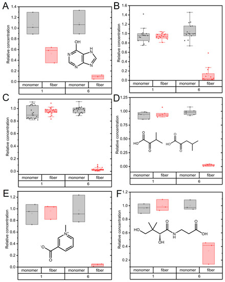 Time-dependent changes in metabolites which showed decreased levels with amyloid fiber treatment compared to monomer treatment. α-synuclein fiber (red) or monomer (black) treatments are shown as box plots. (A) Hypoxanthine; (B) Merged data for TCA cycle metabolites (oxoglutaric acid, succinic acid, malic acid, citric acid, and L-2-hydroxyglutaric acid/3-hydroxiglutaric acid); (C) Merged data for amino acids (Phe, Tyr, Ile, Leu, Ac-Ala, and Ac-Ser); (D) Merged data for α-ketoisovaleraic acid and ketoleucine; (E) Trigonelline; (F) Pantothenic acid (vitamin b5). For (A,E,F), boxes cover the full range of measured data, while for (B–D), the boxes cover the 25–75% range of the data. The line denotes the median. Chemical structures of some metabolites are shown as insets.