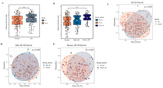Alpha diversity and beta diversity analyses of the gut microbiome between patients with AD and healthy subjects. (A,B) illustrates the comparison of Shannon diversity index across groups. Abbreviations: ns, no significant difference was calculated by the Kruskal–Wallis test. (C–E) Beta diversity analysis across groups. Principal coordinate analysis (PCoA) plot based on unweighted-UniFrac distances, colored by groups—(C) AD vs. normal. (D) Mild_AD vs. normal. (E) Severe_AD vs. normal. p value was calculated by PERMANOVA test with permutation = 999.