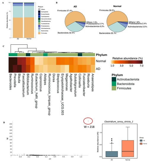 Taxonomic profiling of gut bacterial composition and differential abundant test results using ANCOM between AD and normal groups. (A) Bar plot and (B) pie charts of bacterial composition at the phylum level across groups. (C) Top 20 genera in the gut microbiome of AD and normal groups. (D) Differential abundant genus using ANCOM and boxplot of the relative abundance of Clostridium_sensu_stricto_1. ANCOM is used to find the differential abundant genus across groups. The x-axis is the clr, centered log-ration transformation on relative abundance of each SV, which means the difference in abundance of a given genus between the normal and AD groups. The y-axis is the W value, which is the number of times that the null hypothesis (the average abundance of a given species in a group is equal to that in the other group) was rejected for a given genus.