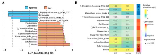 Gut microbial signatures selected by LEfSe analysis and relative abundance of gut microbial biomarkers across groups. (A) Bar plot of LEfSe analysis result. (B) Heatmap displaying the relative abundance of signatures identified using LEfSe analysis in AD and normal groups and correlation between the EASI score and the relative abundance of signatures.