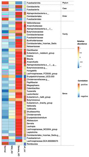 A total of 13 genera were identified as gut bacterial signatures at the genus level between AD patients and healthy individuals using the method of LEfSe (Figure 3, Table S5). Nine genera, including Blautia, Butyricicoccus, Lachncoclostridium, Eubacterium_hallii_group, Erysipelatoclostridium, Megasphaera, Oscillibacter, Flavonifractor, and unclassified genera from the bacteria family of Oscillospiraceae were significantly enriched in the AD group. The other four genera, containing Romboutsia, Clostridium_sensu_stricto_1, and unclassified genera from two bacteria families, Butyricicoccaceae and Erysipelotrichaceae, were considerably enriched in the normal group (Figure 3A and Figure S5, Table S5). Additionally, the relative abundances of Blautia and Butyricoccus were significantly positively correlated with the severity of AD. As the severity of AD deepens, the relative abundance of two genera, Romboutsia as well as Clostridium_sensu_strico_1, and one family, Erysipelotrichaceae, decreases significantly (Figure 3B). Additionally, the enrichment of Bacteroides, Butyricicoccus, and Lachnospiraceae_UCG_008 was notably obtained in the Mild_AD group, while the relative abundance of Blautia in the Severe_AD group was significantly higher than that in the normal and Mild_AD groups (Figures S5 and S6).