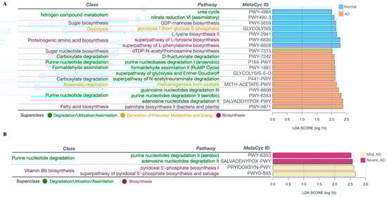 Differentially enriched predicted functional pathways across groups using PICRUSt2 and LEfSe analysis. The bar chart in (A) shows the LDA score (log10) of the enriched pathways between the normal and AD groups. The bar chart in (B) displays the LDA scores (log10) of the enriched pathways in the Mild_AD and Severe_AD groups. Two levels of annotations of each pathway are labeled, and the color of the pathway indicates the superclass to which it belongs. Green represents the superclass of degradation/utilization/assimilation; purple represents the superclass of biosynthesis; orange represents the superclass of generation of precursor metabolites and energy.