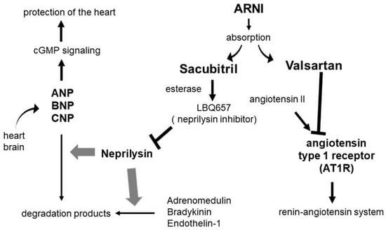 ARNI is a single-molecule combination of ARB, valsartan, and the neprilysin inhibitor, sacubitril (activated by esterase and converted to the neprilysin inhibitor LBQ657) (Figure 2). Neprilysin is an enzyme that degrades natriuretic peptides (ANP and BNP), which are secreted by the heart and known to inhibit the renin-angiotensin system and sympathetic nervous system. ANP and BNP are used for the treatment of acute HF through continuous intravenous administration, which inconveniences chronic HF treatment [40,41].