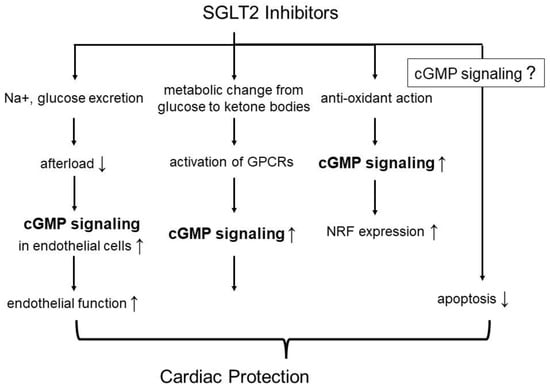 Involvement of cGMP signaling in the cardioprotective mechanism of sodium-glucose co-transporter-2 (SGLT2) inhibitors. Although the contribution of cGMP signaling to cardiac protection has not been established, it is feasible that cGMP signaling contributes to SGLT2 inhibitor-induced cardiac protection. Apoptosis is in part responsible for the protection of the heart. However, there is almost no report on the involvement of cGMP signaling in the inhibition of apoptosis.