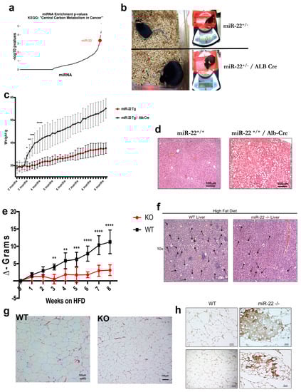 Role of miR-22 in metabolism and obesity. (a) The central carbon metabolism pathway is enriched in miR-22 targets. Dot plot depicting -log10 Fisher’s exact test p-values for all human miRNAs (n = 1077) in TarBase v8 database of experimentally supported miRNA interactions [29156006]. miR-22 is marked in red. (b) Representative comparison between miR-22+/− and miR-22+/−/Alb-Cre littermates at 8 months of age; mice were fed with regular chow for the entire length of the experiment. miR-22Tg/Alb-Cre mice weighed over two times more than their respective littermates without Cre. (c) Comparison between miR-22+/+ transgenic mice with or without Albumin Cre expression. Mice fed with regular chow showed a striking difference between the two genotypes; miR-22+/+-Alb-Cre mice gained much more weight than miR-22+/+ and started to become obese (>40 g) around 6 months of age. The entire colony was over the obesity threshold by 9 months of age (n = 6 per cohort). (d) Livers from miR-22+/+ transgenic mice with or without Albumin Cre were harvested at 10 months of age. H&E staining revealed marked liver steatosis in miR-22+/+-Alb-Cre mice fed regular chow, while there was no sign of liver steatosis in livers from WT mice. (e) HFD-fed miR-22 deficient mice failed to gain weight compared to WT littermates, suggesting a role of miR-22 in diet-induced obesity (n = 5 per cohort). (f) Livers from miR-22−/− mice were harvested after 8 weeks on an HFD. H&E staining revealed a strong protective effect against hepatic steatosis in the mice lacking miR-22. (g) After 8 weeks on an HFD, mice were sacrificed and tissues harvested. WAT from miR-22-KO and WT mice stained with H&E showed a significant difference in adipocyte size, which was much smaller in miR-22 KO mice compared to their WT littermates. (h) WAT from WT and miR-22−/− mice fed an HFD for 8 weeks was stained for UCP-1; miR-22-deficient mice showed strong staining, suggesting brownization of WAT in miR-22 null mice. *, p < 0.05; **, p < 0.01; ***, p < 0.001; ****, p < 0.0001.