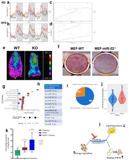 Next, we asked whether the lack of weight gain in miR-22−/− mice was due to changes in food intake or energy expenditure. At baseline, WT and miR-22−/− mice showed no differences in oxygen consumption (VO2), food intake, respiratory exchange ratio or locomotor activity (Figure 2a,c and Supplementary Figure S2a). However, after 8 weeks on HFD, the miR-22/− mice had a significantly higher VO2 consumption compared to WT mice (Figure 2b). This effect was independent of the differences in body weight, as shown by an analysis of covariance (ANCOVA) [] (mass effect: p = 0.0166; group effect: p < 0.001) (Figure 2d). During the entire length of the study, we observed no changes in food intake between the WT and miR-22−/− mice (Supplementary Figure S2b), indicating that the effect of miR-22 loss of function on body weight is not related to a decrease in appetite. Data collected from metabolic cages showed no difference in respiratory exchange ratio or locomotor activity (Supplementary Figure S2b) between the two mouse cohorts; however, thermal camera analysis revealed that the body temperature was on average 3 degrees higher in miR-22−/− mice compared to WT animals (Figure 2e and Supplementary Figure S2c). The thermal signal was localized in the intra-scapular area, where brown fat accumulates, and was more pronounced in miR-22−/− mice compared to WT littermates, suggesting that loss of miR-22 function leads to metabolic reprogramming when the miR-22 KO mice are challenged with an HFD. In addition, embryonic fibroblasts (MEFs) isolated from miR-22−/− mice were much less prone to adipocyte differentiation compared to WT cells (Figure 2f and Supplementary Figure S2d). Taken together, these findings imply that miR-22 is involved in fat accumulation and that its overexpression leads to an obese phenotype. By contrast, fat accumulation is impaired in miR-22 KO mice fed a HFD, likely due to metabolic rewiring resulting in increased energy expenditure and suppression of weight gain.