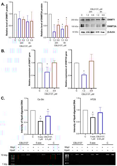 Therefore, the main goal of our study was to analyze the effects of CBL0137 on the epigenetic regulation of gene expression via DNA methylation and histone modification mechanisms. Determining specific aims of our study we concentrated on the enzymes characterized as participating in epigenetic silencing in HeLa TI cells as epigenetic activity of CBL0137 was shown on that model system. In particular, to characterize the influence of CBL0137 on DNA methylation, we analyzed DNMT1 and DNMT3A enzyme levels and the expression levels of corresponding genes in HeLa TI cells treated with the drug. Since HeLa TI DNA is hypomethylated to demonstrate the consequences of CBL0137’s influence on global DNA methylation, we chose Ca Ski, a cell line of the same histology but with a higher level of DNA methylation. Additionally, we analyzed the changes in the level of DNA methylation after CBL0137 treatment in HT29 cells, in which DNA had a hypermethylated profile. Then, we analyzed CBL0137’s influence on histone modifications by evaluating the level of the integral acetylation of histone H3, as well as the expression and activity of HATs (HAT1, CBP, and P300) and HDACs (HDAC1 and HDAC3); the expression of the proteins from the BET family; the level of histone modifications H3K9me3, H3K27me3, and H4K20me3; and the expression of HMTs SUV39H1/H2, SUV420H1/H2, G9a, EZH2, and DOT1L.
