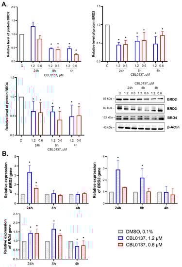 Using RT-qPCR, we found an increase in BRD2 gene expression by 3.4- and 1.6-fold after 24 h of treatment with 1.2 μM and 0.6 μM of CBL0137, respectively (Figure 3B). BRD3 gene expression was increased by 2.2-fold after the 8 h of incubation with CBL0137 (1.2 μM) and by 2.9-fold after 24 h. Notably, 4 h incubation of the cells with CBL0137 in the concentrations of 1.2 μM and 0.6 μM led to a weak but reproducible decrease in BRD4 expression (by 1.4- and 1.3-fold, respectively). However, after the 8 h of treatment, BRD4 expression was increased by 1.3- and 1.7-fold, correspondingly. In 24 h of incubation, the increase in BRD4 expression was 1.4-fold in the case of both CBL0137 concentrations.