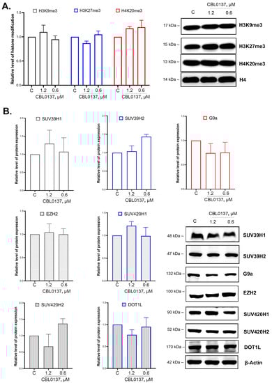We evaluated CBL0137’s effects on the enzymes responsible for H3 and H4 histone methylation. We selected the following enzymes as putative targets: SUV39H1 and SUV39H1 (di- and trimethylation of H3K9), G9a (mono- and dimethylation of H3K9), EZH2 (methylation of H3K27), SUV420H1 and SUV420H2 (di- and trimethylation of H4K20), and DOT1L (methylation of H3K79). The protein expression level was detected via Western blotting. We observed no significant changes in SUV39H1, SUV39H2, and G9a protein expression levels after 24 h of the treatment of the cells with 1.2 μM and 0.6 μM of CBL0137 (Figure 4B). We also did not detect any changes in EZH2, SUV420H1, SUV420H2, and DOT1L expression.