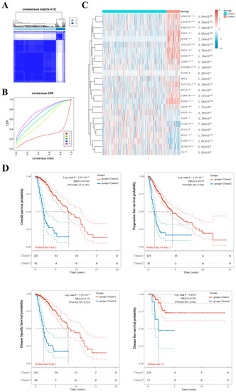 2.2. Consensus Clustering Analysis of FRGs Revealed Significant Differences in Baseline Characteristics and Survival between Two Patient Clusters