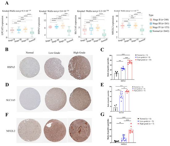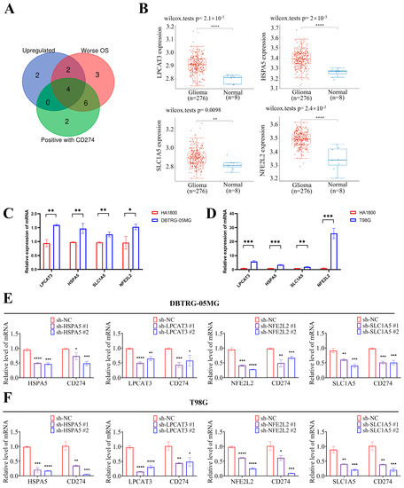 2.4. Four Key FRGs (LPCAT3, SLC1A5, HSPA5, and NFE2L2) Were Upregulated in Glioma Tissues