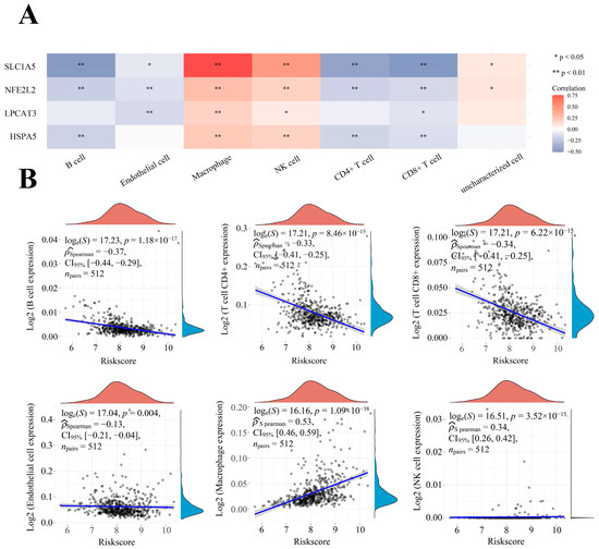 2.5. Correlation between Four Key FRGs and the TME Heterogeneity