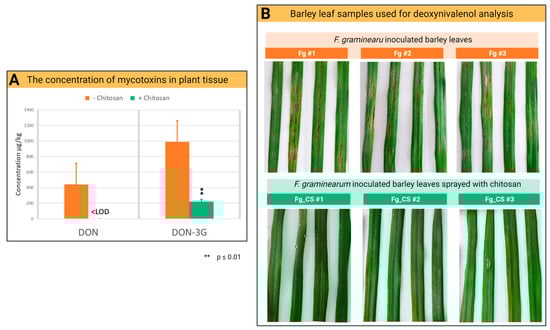 2.3. Chitosan Treatment Reduces the Accumulation of Mycotoxins of F. graminearum in Barley Leaves