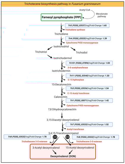 - Kimura, M.; Tokai, T.; O’Donnell, K.; Ward, T.J.; Fujimura, M.; Hamamoto, H.; Shibata, T.; Yamaguchi, I. The trichothecene biosynthesis gene cluster of Fusarium graminearum F15 contains a limited number of essential pathway genes and expressed non-essential genes. FEBS Lett. 2003, 539, 105–110. [Google Scholar] [CrossRef]