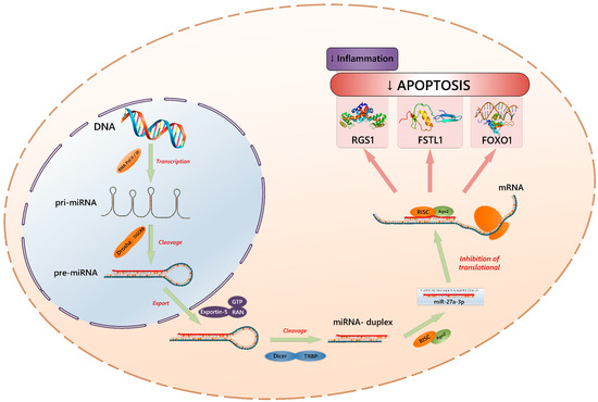 The process of RNA interference involving microRNAs in the example of miR-27a-3p. DNA—deoxyribonucleic acid; RNA Pol II/III—RNA polymerase II or III; pri-miRNA—primary miRNA; Drosha—class 2 ribonuclease III enzyme; DGCR8—DiGeorge syndrome critical region 8; pre-miRNA—precursor miRNA; RAN—RAs-related nuclear protein; GTP—guanosine triphosphate; Dicer—endoribonuclease Dicer or helicase with RNase motif; TRBP—transactivation response RNA binding protein; RISC—RNA-induced silencing complex; Ago2—Argonaute 2; mRNA—messenger RNA; RGS1—regulator of G protein signaling 1; FSTL1—follistatin-related protein 1; FOXO1—forkhead box protein O1, ↓—inhibition.