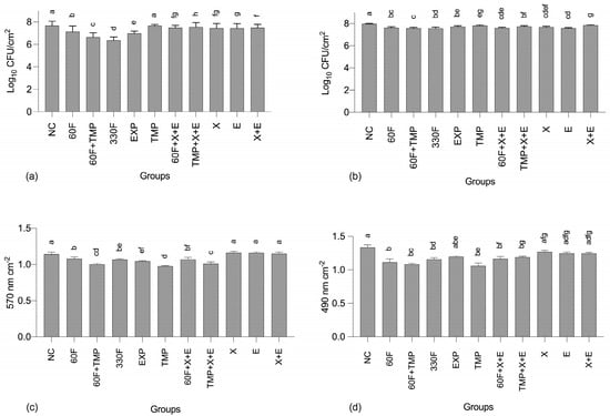 Logarithm of colony-forming units cm2 for S. mutans (a) and C. albicans (b), and absorbance values cm2 obtained for the total biomass (c) and metabolic activity (d) quantification assays. Error bars denote the SD of the means. Different lowercase letters symbolize statistical differences among the groups (p < 0.05, n = 9). NC: negative control (untreated biofilms), “60F” = 60 ppm F; “330F” = 330 ppm F; “X” = 4.8% Xylitol; “E” = 1.2% Erythritol.