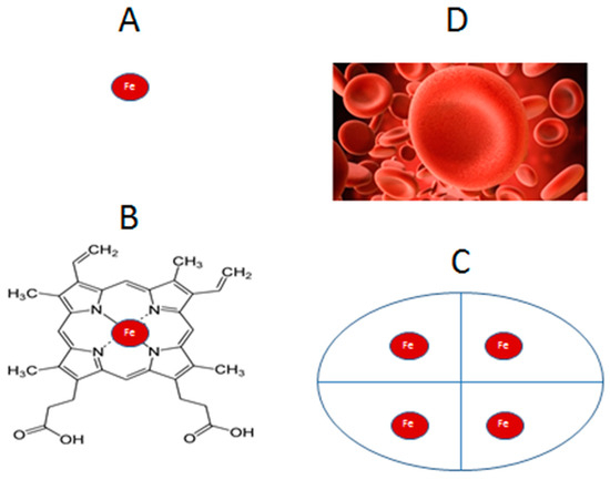The important role of iron in heme, hemoglobin, and red blood cells. A cartoon representation of the essential role of iron (red circle, (A)), which is responsible for the red color of blood. Iron is embedded in a protoporphyrin ring forming heme (B), which is the prosthetic group in each of two alpha and two beta globin chain components of the protein hemoglobin (C). Each hemoglobin molecule (C) contains four molecules of iron, which are responsible for binding and carrying oxygen. The protein hemoglobin is the main constituent (95%) of red blood cells, as shown in the picture in (D).